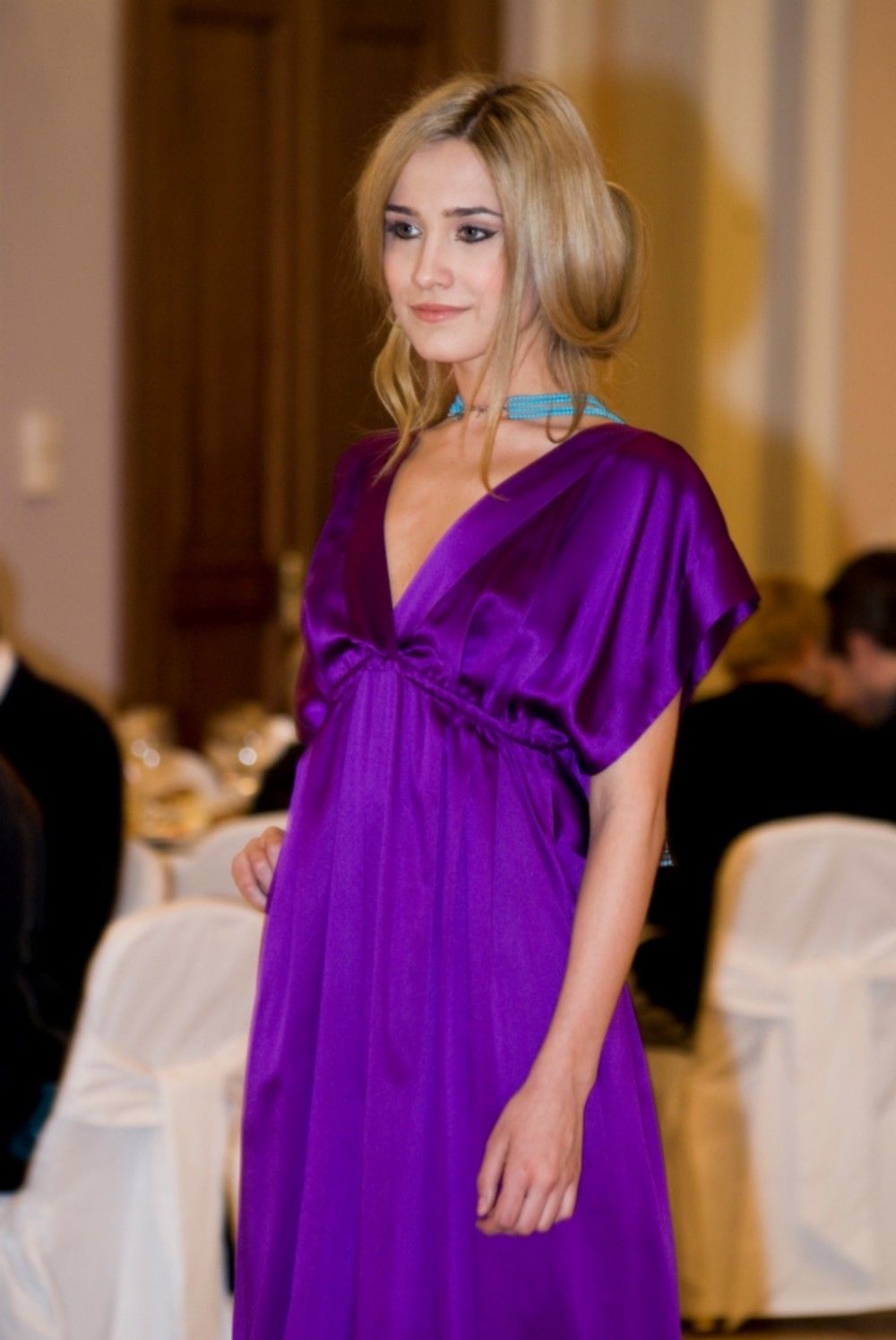 Эта модель отличается своим необыкновенным фасом и насыщенным цветом. Платье имеет V-образный вырез, который позволяет продемонстрировать красивую линию декольте, стройную шею и акцентировать внимание на лице.