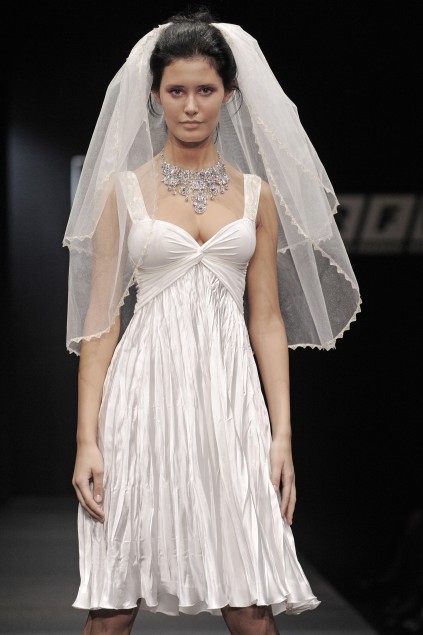 Длина платья – до линии колен. Юбка свободная, украшена многочисленными угловыми складками, благодаря чему, платье смотрится очень необычно и стильно.