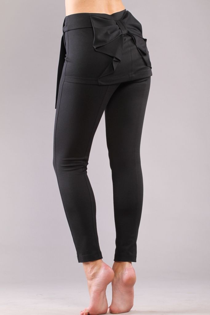 Узкие трикотажные брюки с оригинальным дизайном. По передним и задним половинкам брюк выполнены продольные рельефы, которые отстрочены отделочной строчкой. Брюки посажены на широкий пояс. Спереди на поясе расположены две шлевки. В боковые швы пояса встрочен дополнительный декоративный пояс, который завязывается спереди. По задним половинкам в области бедер острочена складка, которая имитирует мини-юбку. От нижней линии пояса до нижнего края складки в области ягодиц заложен красивый мягко спадающий фалдами бант, закрепленный в верхней части шлевкой. Низ модели отстрочен широкой отделочной строчкой.