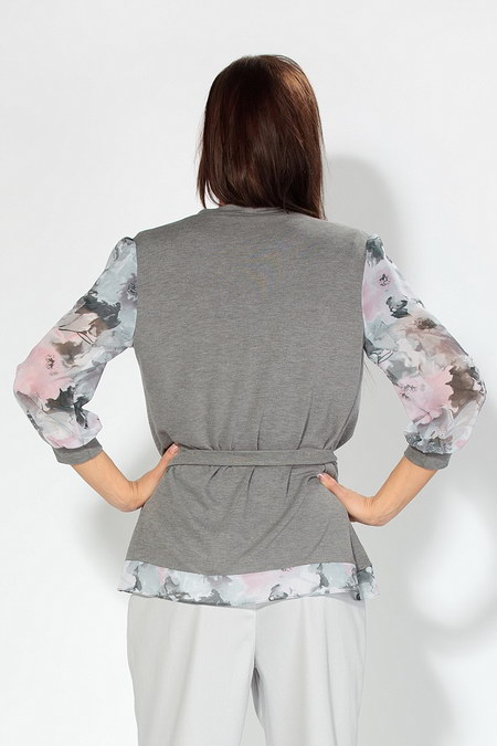 Прекрасная цветовая гамма - элегантный серый оттенок полочек и спинки и нежный розовый принт на рукавах и оторочке. Рукава три четверти, завязывается жакет на узкий длинный поясок, создан из струящейся, приятной к телу ткани.