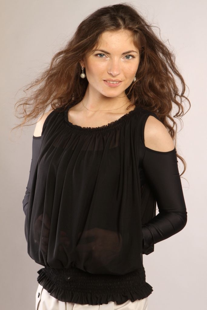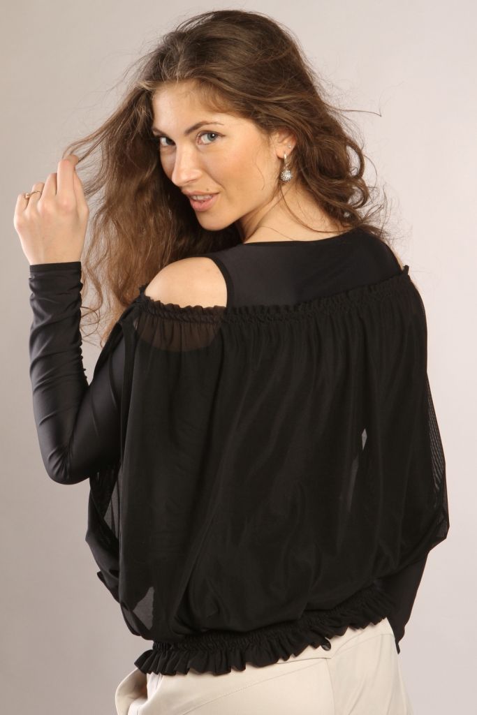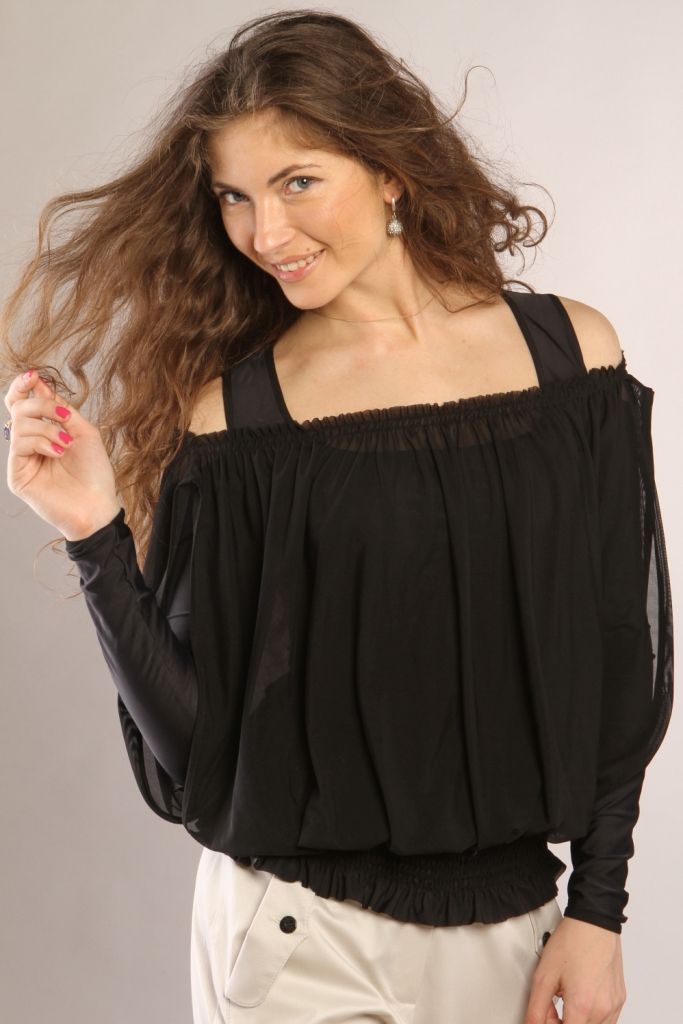 Свободная летняя блуза, выполненная из двух различных типов тканей, расположенных один над другим. Основа модели выполнена из трикотажного полотна и представляет собой плотно облегающую фигуру майку с пристроченными рукавами. Но при этом плечо оголено. Горловина, верх и низ рукава обработаны тонкой тесьмой. Поверх основы на модель нашита накидка из легкой шифоновой ткани. По верхнему краю она собрана на резинку. Боковые швы отсутствуют, вместо этого, срезы обработаны тесьмой. По нижнему краю обе части модели закреплены и собраны широкой резинкой.