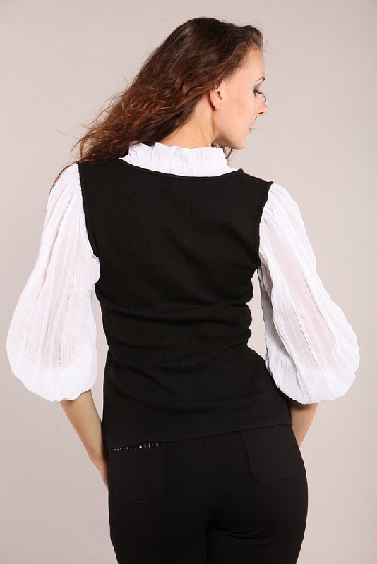 Блуза выполнена в форме жилета из вязаной ткани черного цвета с рукавами контрастного цвета и воротником.