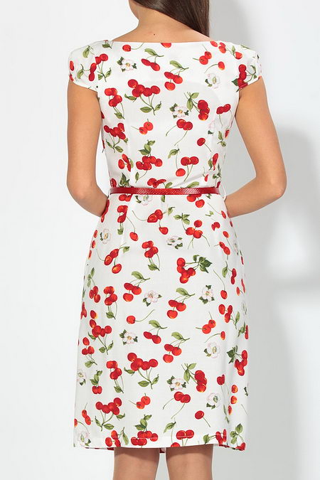 Элегантный покрой прекрасно сочетается с трогательным принтом "вишенки". Классическое сочетание цвета – красное на белом - по новому смотрится в оригинальном исполнении. Это платье надолго создаст Вам хорошее настроение, а благодаря натуральному материалу подарит ощущение свежести. Тоненький красный ремешок прекрасно подчеркивает талию и завершает образ. В этом платье Вы будете выглядеть и чувствовать себя настоящей летней феей.