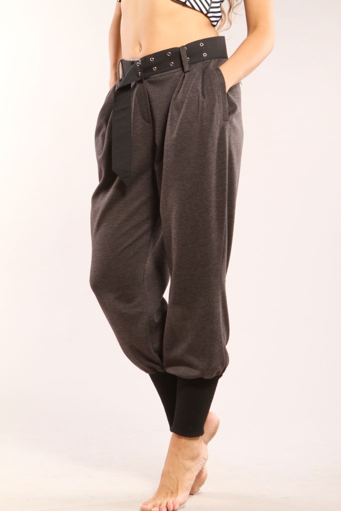Свободные серые брюки-галифе из трикотажного полотна с примесью шерсти.