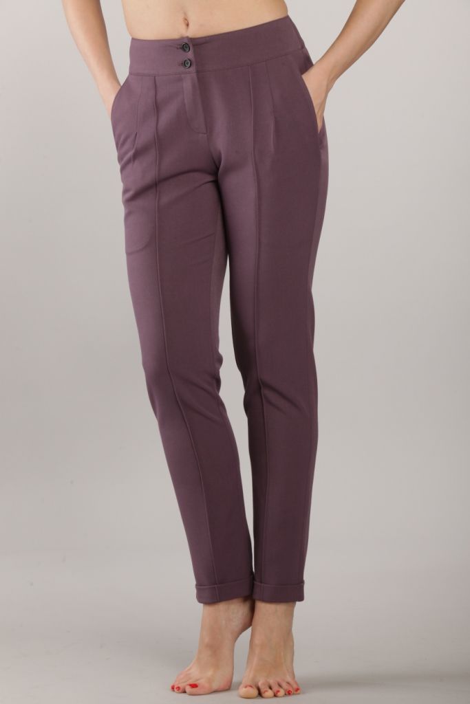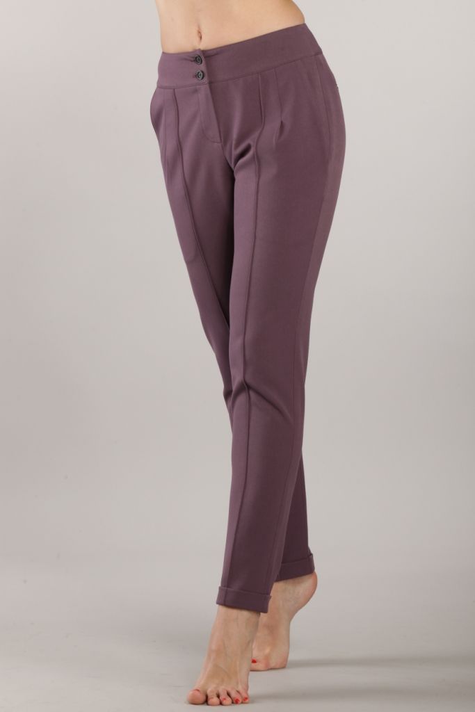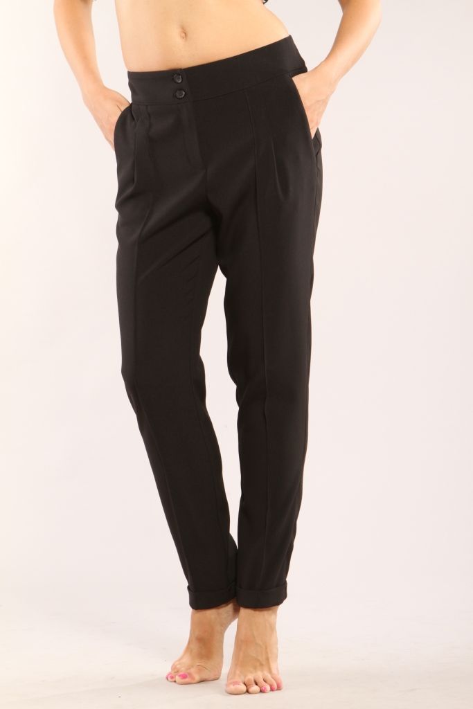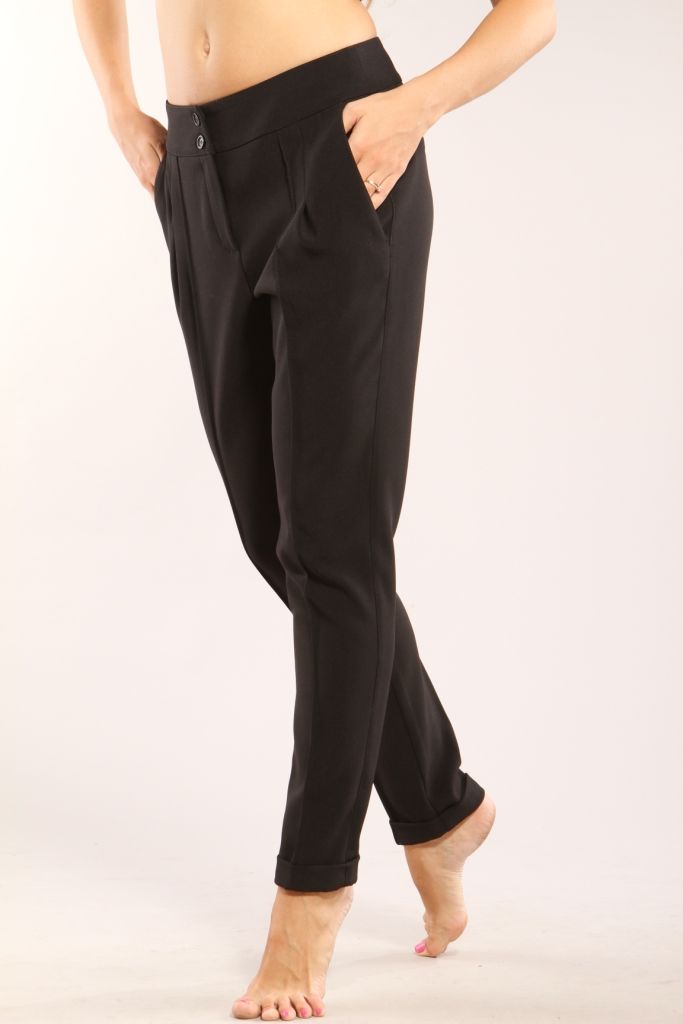 Стрейчевые черные брюки свободного силуэта, зауженные к низу. По задним полотнищам застрочены небольшие вытачки. По передним полотнищам отделочной строчкой в 1мм отстрочена стрелка. Рядом расположена глубокая застроченная склада. Вдоль бокового шва расположен боковой карман. Модель посажена на широкий пояс, который застегивается на две прорезные петли и две пуговицы. Брюки застегиваются на молнию расположенную спереди и отстроченную отделочной строчкой. Длина изделия – до щиколоток. По низу брюк расположены манжеты, завернутые наверх изделия и прикрепленные по боковому шву.
