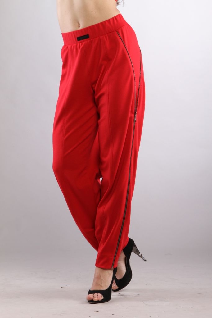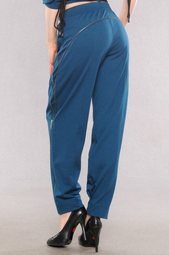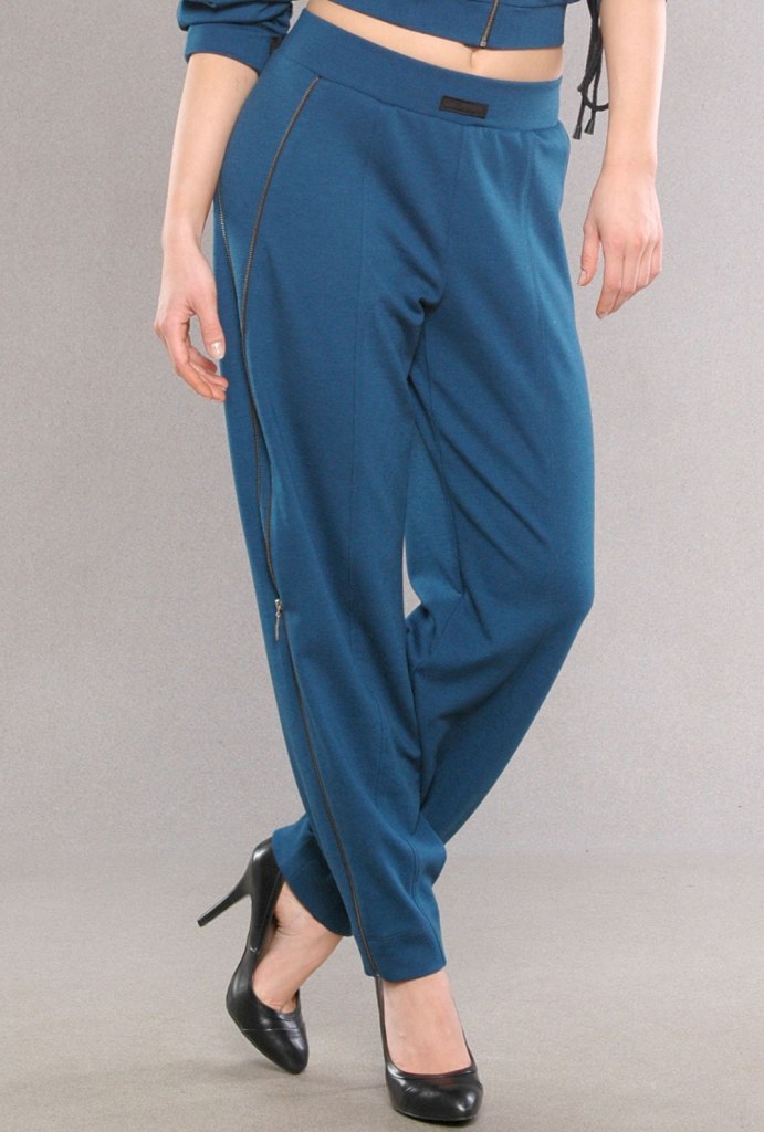 Свободные трикотажные брюки спортивного покроя. По передним половинкам по центру выполнены рельефы, отстроченные отделочной строчкой. Модель посажена на широкий пояс. Боковой шов отсутствует, вместо него расположена большая фигурная кокетка, которая идет по всей высоте изделии, вверху плавно переходя на полочку и образуя по спинке широкую полосу. В края кокетки вставлена молния, которая при застегивании и образует боковой шов. По задним половинкам также выполнены рельефы, которые начинаются от кокетки и идут до самого низа, также отстроченные отделочной строчкой. Низ модели подвернут, и отстрочен широкой отделочной строчкой.