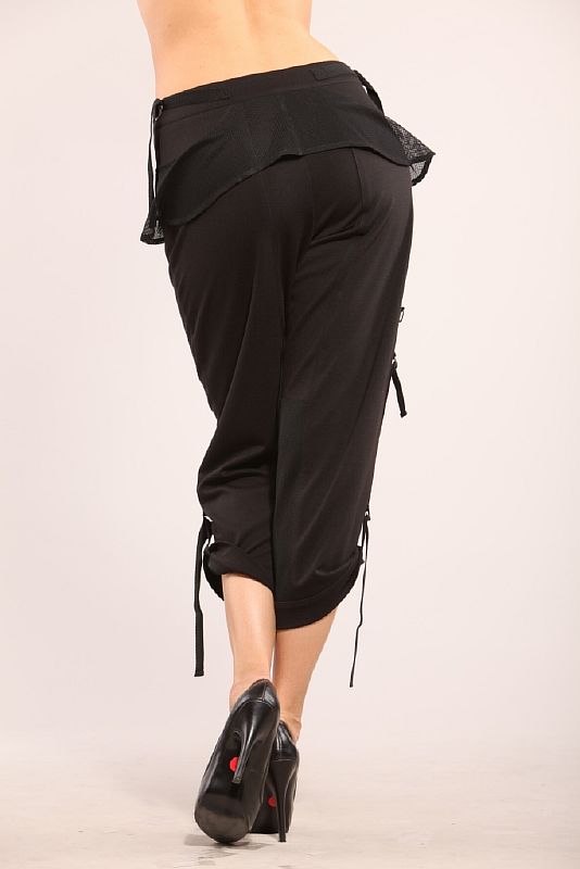 По передним и задним половинкам проходят продольные рельефы, отстроченные одной отделочной строчкой. Брюки застегиваются на открытую металлическую молнию. Модель посажена на пояс. По поясу настрочены узкие атласные ленты черного цвета, которые застегиваются на два полукольца по боковым швам. Край атласной ленты свободно свисает. Вокруг всей модели в районе бедер настрочена фигурная декоративная деталь из сеточки. По низу модели проходит широкая отделочная строчка. По боковому шву также пристрочена атласная ленточка с полукольцами. Второй край пристрочен изнутри и застегивается на полукольца снаружи.