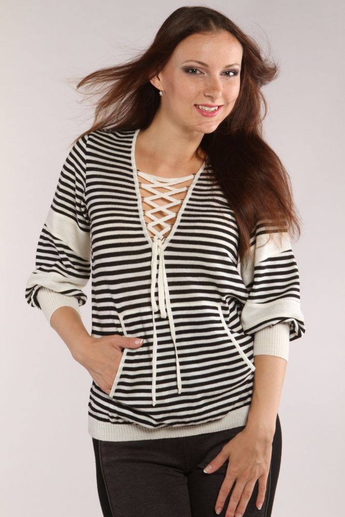 Легкий тонкий джемпер из вязаного трикотажа в мелкую горизонтальную полоску. Глубокий треугольный вырез, доходящий до линии груди, обработан узкой полоской из белого вязаного трикотажа. Также вырез декорирован лентой зашнурованной косой шнуровкой и завязанной на бант. Концы ленты продеты в маленькие полукольца, закрепленные на обтачке горловины. Рукав свободный, длинный с манжетом. По верхней трети рукава горизонтально втачена широкая полоска контрастного белого цвета. Низ модели обработан резинкой. По центру переднего полотнища притачен большой карман типа «кенгуру». Края кармана также обработаны узкой белой полосой.