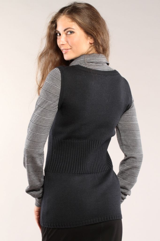 Вязаный плотный длинный жилет черного цвета. Модель выполнена без застежки из цельного полотна. Глубокий вырез горловины в форме «каре» обработан узкой полосой из вязаного полотна типа резинки. По центральной части изделия, на талии жилет выполнен широкой резинкой в мелкий рубчик. Таким образом, он отлично подчеркивает фигуру, делая акцент на талии. Пройма рукава обработана также узкой полосой из вязаного полотна. Длина модели – ниже линии бедра. По низу изделия проходит узкая полоса из вязки в виде резинки, которая придает завершенность данной модели.