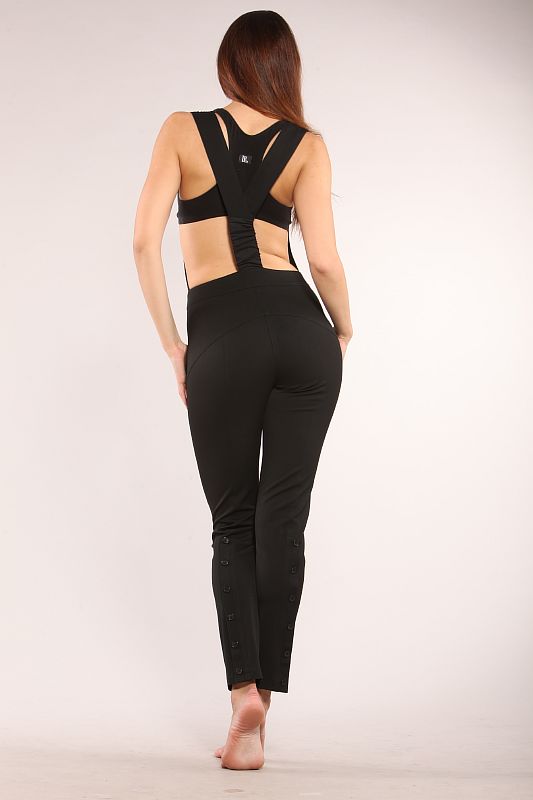 Комбинезон отличается своим необычным покроем и фасоном. Брюки прямые, прилегающие к ногам. Очень красиво и стильно смотрятся. Верхняя часть комбинезона представляет собой прямое полотнище, украшенное рядом из мелких пуговиц, и двумя металлическими змейками. Две широкие бретели переходят в широкий угол на спине, который плавно переходит в одну серединную бретель, крепящуюся к брюкам.