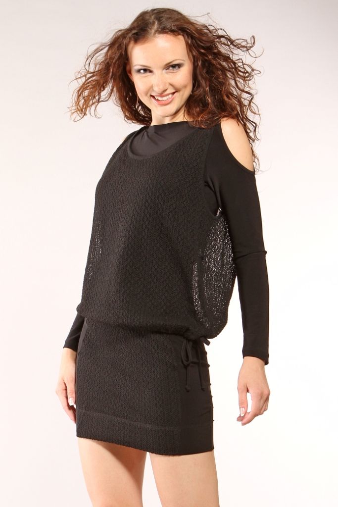 Стильное короткое молодежное платье из двух видов тканей. Основу модели составляет плотно облегающая туника черного цвета из трикотажного полотна. Узкий вырез горловины в форме «лодочки» обработан лентой в тон основной ткани. Рукав длинный, в верхней части рукава плечо открытое, вырез отстрочен узкой отделочной строчкой. Заднее полотнище выполнено из двух половинок со швом посередине. По низу изделия и по рукаву проходит широкая отделочная строчка. По центральной части юбки спереди настрочена широкая вставка из вязаного трикотажа. Модель дополнена свободным вязаным жилетом, по низу завязывающимся на шнурок и выполненным их того же трикотажа что и вставка на юбке.