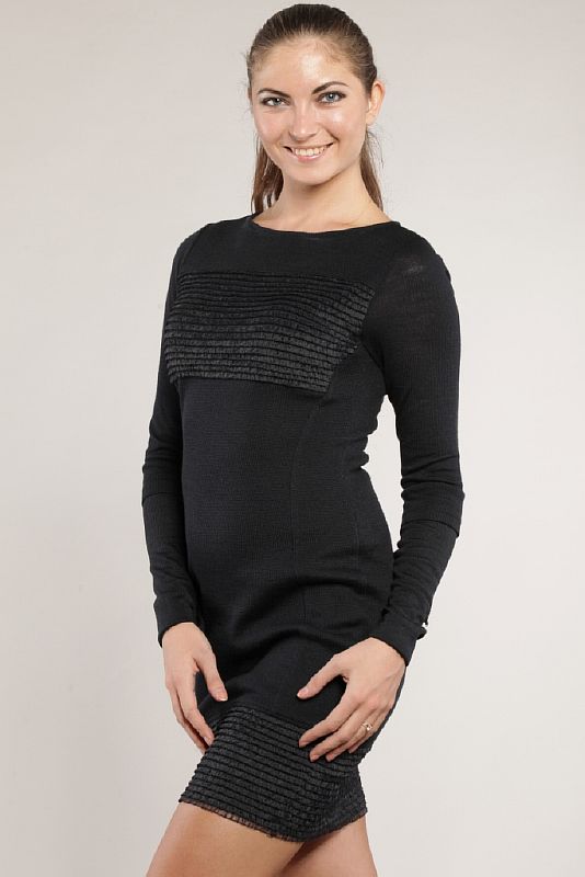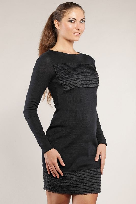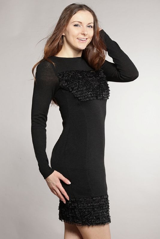 Нарядное черное платье, облегающего силуета. Вырез горловины «лодочкой», обработанный узкой черной полосой из основной ткани. Рукав длинный, втачной, плотно облегающий руку. По низу рукава проходит широкая отделочная строчка. Вдоль бокового шва по полочкам проходят рельефы, отстроченные отделочной строчкой. Спинка состоит из двух частей со швом посередине. Спереди в верхней части платья встрочена широкая кокетка, выполненная из многослойной бахромы. Длина модели – выше колен. Низ платья выполнен из той же широкой бахромы.