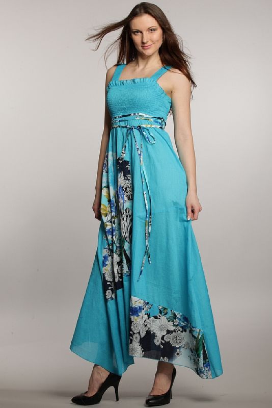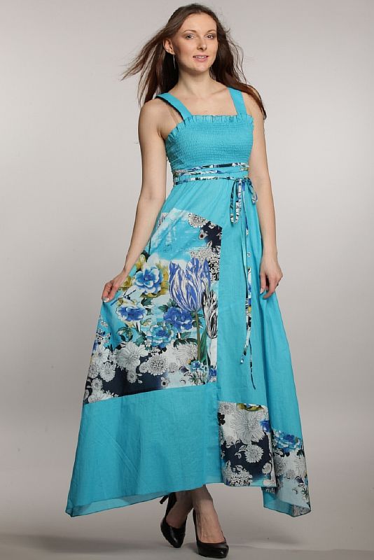 Легкий летний сарафан с ярким цветочным принтом. Модель выполнена из хлопчатобумажной ткани. Полочка цельнокроеная, жатая и посаженная на узкую резинку, которая проходит горизонтально по всей площади полочки. По верхнему краю обработана рюшем. Юбка свободная, из четырех полотнищ, покроенная широкими клиньями, которые расширяются к низу, и свисают по бокам. Клинья дополнены горизонтальными подрезаим. Линия талии завышена. По линии талии несколько раз обернут и завязан узкий цветастый поясок. Верх платья посажен на широкие бретельки. Длина модели – до щиколоток.