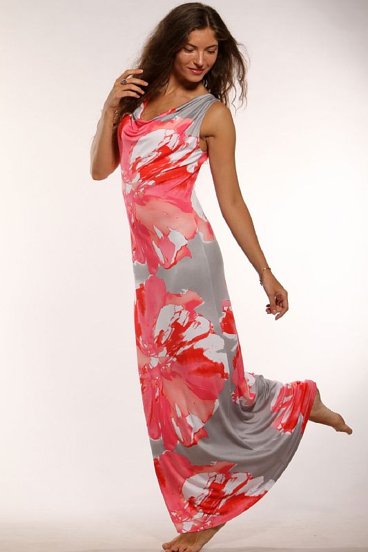 Легкое летнее платье в пол. Модель выполнена из трикотажного полотна в яркий, броский рисунок. Переднее и заднее полотнища цельнокроеные. От линии бедра модель расширяется к низу. Низ отстрочен узкой отделочной строчкой. Линия проймы обычная, обработанная подкройной обтачкой. Линия плеча укорочена. Вырез горловины V-образный. По краю горловины ткань спадает мягкими фалдами. По спинке вырез горловины круглый и слегка углубленный. Модель идеальна для носки в летний период, благодаря своему покрою и расцветке.