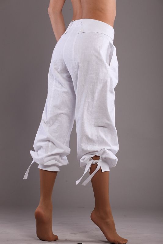Легкие летние бриджи из мягкой ткани белого цвета. По задним половинкам проходят продольные рельефы, отстроченные отделочной строчкой. По передним половинкам заложены две глубокие застроченные складки. Вдоль боковых швов обработаны прорезные карманы. Модель застегивается на молнию спереди. Пояс изделия комбинированный, мягко переходящий в накладную кокетку, закрепленную по отлетным краям пуговицами. Пояс застегивается на прорезную петлю и пуговицу. Сзади на поясе, на видимой его части, расположена вышивка. По низу изделия проходят широкие манжеты, выстроченные отделочными строчками. По верхнему краю манжет закрепляется пристроченными лентами, завязанными узлом.