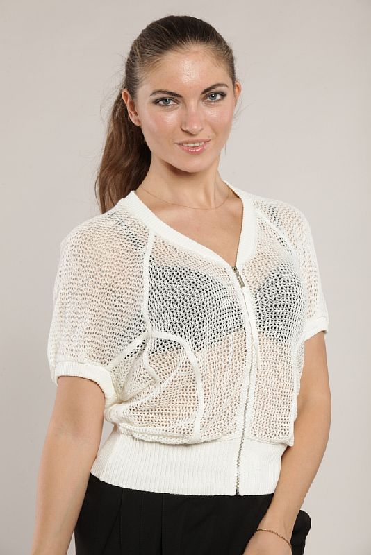 Свободный джемпер оригинальной конструкции, выполненный вязкой в «сеточку». Вырез горловины V-образный, обработанный по краю вязаной резинкой. Рукав выполнен в форме «реглан», пройма занижена. По низу рукав обработан такой же вязаной резинкой, как и по горловине. По переду проходят продольные рельефы. Все стачные швы обработаны отделочными лентами из узкого вязаного полотна. Спереди модель застегивается на металлическую молнию. По низу изделия проходит широкая резинка из того же вязаного полотна. В центральной части спинки настрочена бирка с логотипом производителя. Длина модели – до талии.
