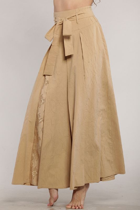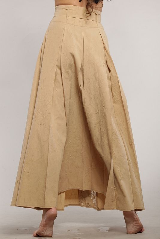 Длинная свободная юбка из трикотажного полотна с гипюровыми вставками. По линии талии модель посажена на широкую кокетку. На кокетке расположены узкие шлевки, в которые продет пояс из основной ткани. Пояс завязывается спереди на бант. По левому боковому шву кокетки встрочена потайная молния. На заднем полотнище расположены три глубокие, встречные склады. На переднем полотнище расположены такие же встречные склады, но в глубине склады находится вставка из гипюрового полотнища. По нижнему краю модель отстрочена узкой отделочной строчкой.