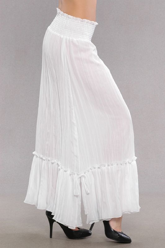 Длинная летняя юбка из жатого шифона белого цвета. Переднее и заднее полотнища цельнокроеные. По верху модели проходит широкий пояс в виде кокетки. По всему поясу настрочена узкая резинка в несколько продольных полос. Верхний край пояса образует рюш. По нижнему краю изделия настрочена широкая полоса из основного шифона таким образом, что верхний край этой полосы создает рюшевую отделку. По боковому шву по всей ширине настроченной широкой полосы проходят разрезы, декорированные завязанными бантами из основного материала. Нижний край изделия обработан строчкой «зигзаг».