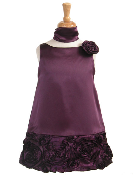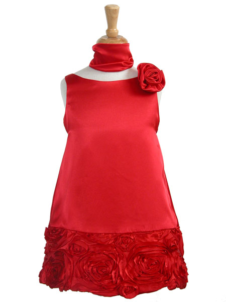 Трепецивидный силуэт, низ, украшенный стильным объемным рисунком из роз, роза на линии плеча и, наконец, палантин на шее, который входит в комплект.