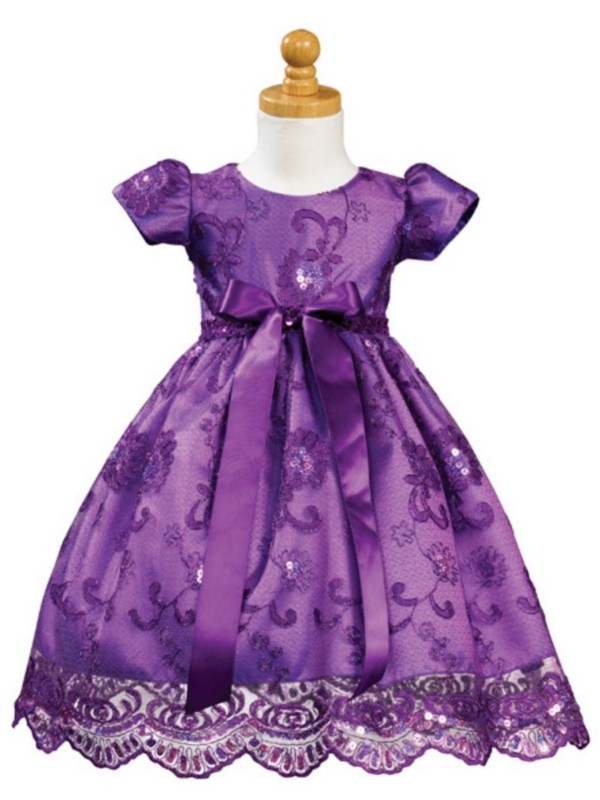 Оригинальное нарядное детское платье в розовых тонах, выполненное из двух типов тканей. Основу платья составляет атласная ткань малинового цвета. Поверх нее расположена шифоновая ткань с вышивкой, украшенной пайетками и бисером. Полочка цельная, спинка со швом посередине и застежкой «молния», расположенной в нем. По линии талии платье отрезное. По талии проходит узкий декоративный поясок, посаженный на резинку. Спереди пояс дополнен небольшим завязанным бантиком со свисающими краями. Рукава небольшие, присобранные по окату. По нижнему краю шифоновая юбка обработана фигурной вышивкой.