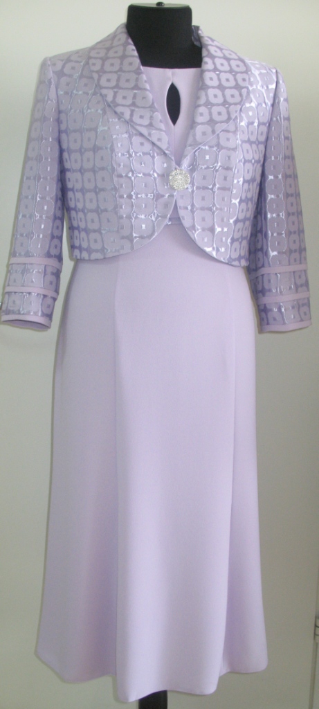 Платье приталенного силуэта, в области декольте вырез-капелька. Жакет с круглыми полами, шалевым воротником и рукавами 3/4.