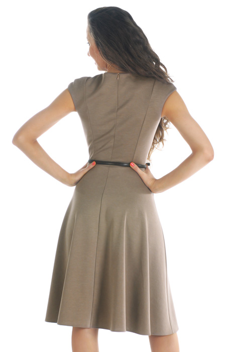 Отличительной особенностью данной модели является её фасон. Верхняя часть платья – приталенная. Рукава короткие, слегка прикрывающие плечи. Вырез горловины – небольшая лодочка.