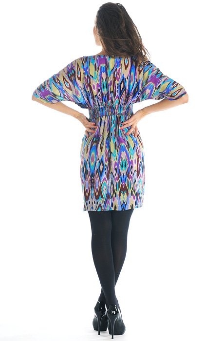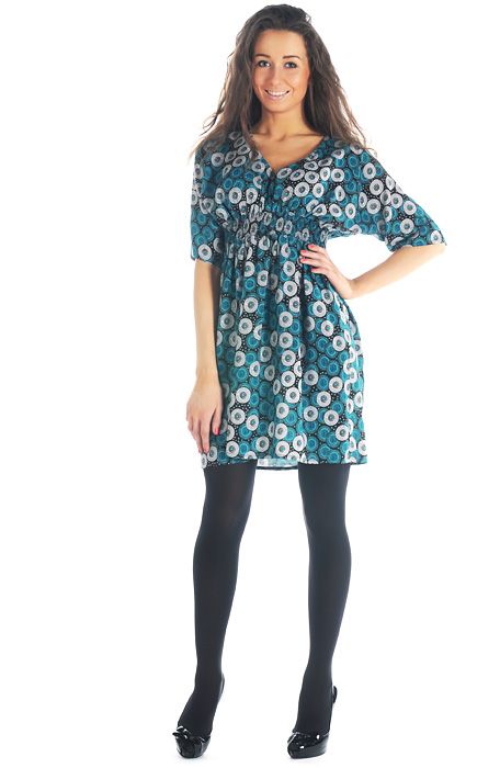 Отличительной особенностью данной модели является её фасон. Рукава короткие, прикрывающие плечи. Длина платья – выше линии колен. Вырез горловины – глубокий, V-образный. Под линией груди платье отрезное. Благодаря широкой резинке, проходящей под линией груди, смотрится очень необычно. Это делает наряд необыкновенным и привлекательным. Платье отлично садится по фигуре и нарядно смотрится. В нём вы сможете пойти на прогулку с подругами или на работу в офис жарким летним днём. Отлично сочетается с обувью на высоком каблуке или на низком ходуБЕСПЛАТНАЯ ДОСТАВКА (почтой России)