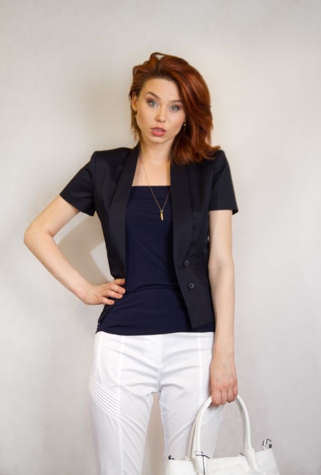 Модель выполнена из натуральной ткани благородного тёмно-синего оттенка, дополнительно декорирована отстрочкой в тон. Жакет застёгивается на две пуговицы. Приталенный крой модели позволяет носить его как с платьем, так и с юбкой, брюками, джинсами или шортами.