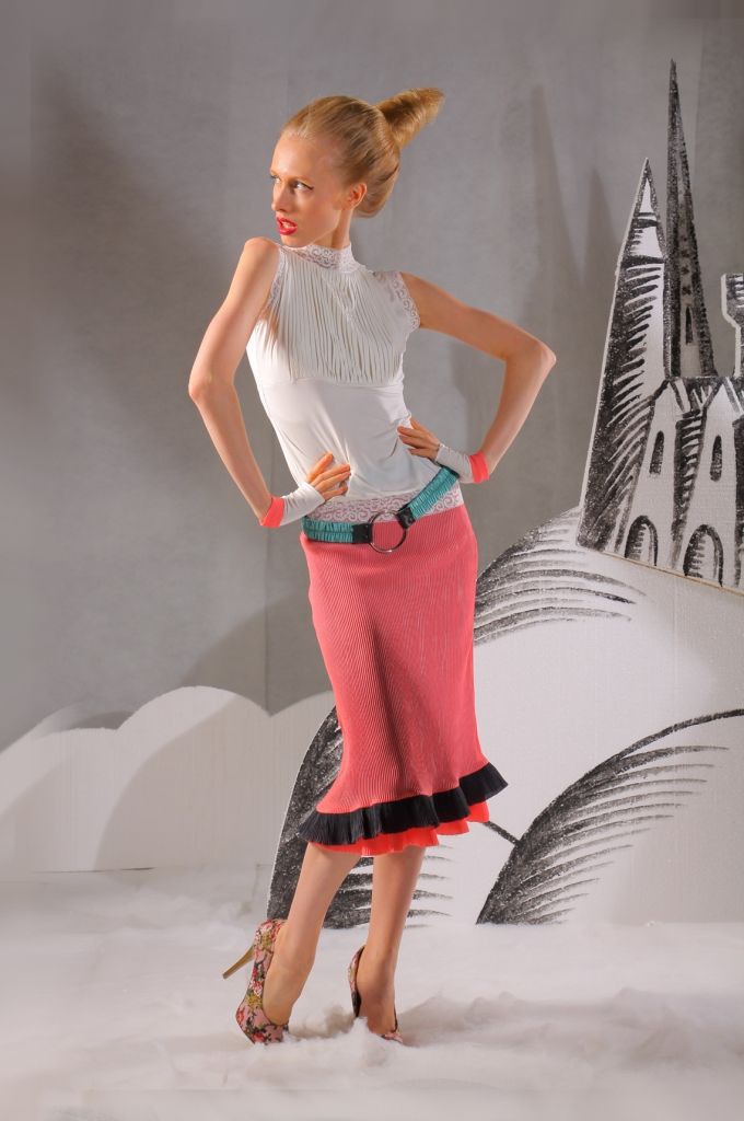 Невероятный и очень интересный фасон делает эту вещь неповторимой и привлекательной. Юбка имеет длину чуть ниже линии колен. Прямой покрой позволяет ей отлично садиться по фигуре. Подол немного расклешен, украшен небольшими воланами, которые делают этот наряд более привлекательным и необычным. Внизу имеется вставка из чёрной ткани, которая придаёт юбке пикантности. Модель отлично смотрится под обувь на высоком каблуке, а так же хорошо сочетается с разнообразными блузами.