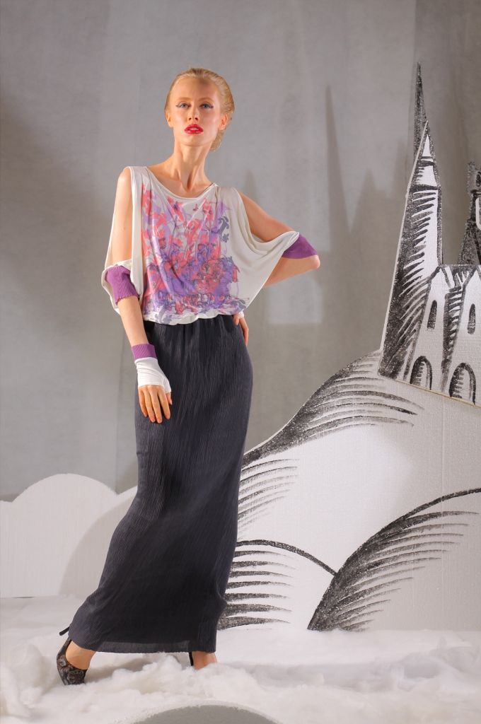 Модель достаточно необычная. Уникальность достигается необыкновенным фасоном и смелыми дизайнерскими решениями. Верхняя часть платья выполнена в виде свободной лёгкой блузы. Рукава - три четверти, с разрезами посередине. У основания – плотные манжеты. Вырез горловины – круглый, немного свободный, открывающий шею.