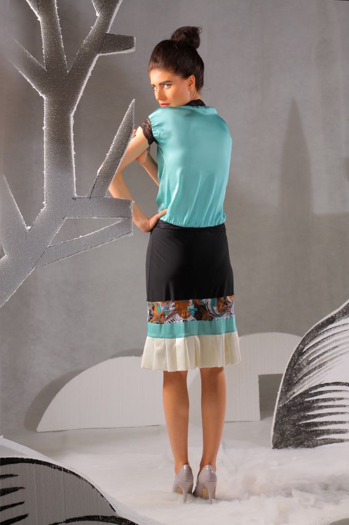 Фасон модели достаточно необычный и экстравагантный. Юбка имеет длину чуть выше линии колен. Прямой покрой позволяет ей отлично садиться по фигуре. Подол немного расклешен, украшен небольшими воланами, которые делают этот наряд более привлекательным и необычным. Внизу имеется несколько декоративных вставок из бирюзовой и пёстрой тканей. Модель отлично смотрится под обувь на высоком каблуке, а так же хорошо сочетается с разнообразными блузами.
