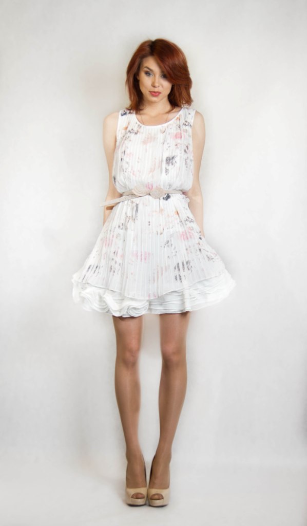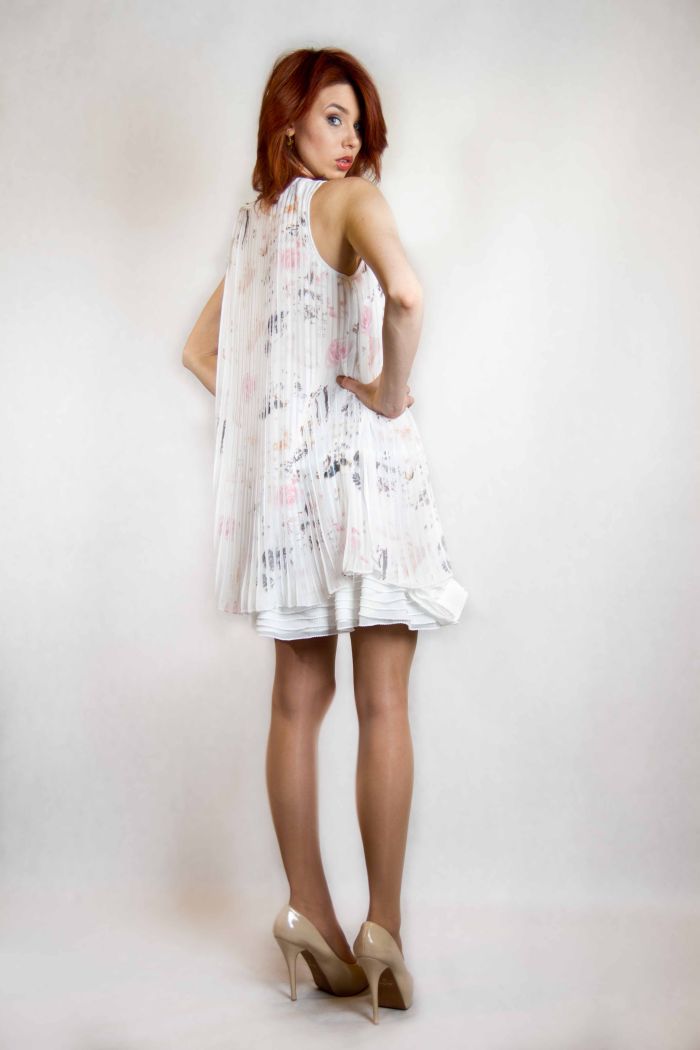 Платье прекрасно подойдет для жарких дней благодаря свободному покрою и отсутствию рукавов. Верхний слой из ткани-плиссе отвечает последним модным тенденциям, стройнит и придает силуэту графичность благодаря вертикальным линиям. Внутренние оборки создают эффект пышной нижней юбки, что делает образ очень женственным и романтичным. Легкий светлый принт смотрится кокетливо и разбавляет строгость основного белого цвета.
