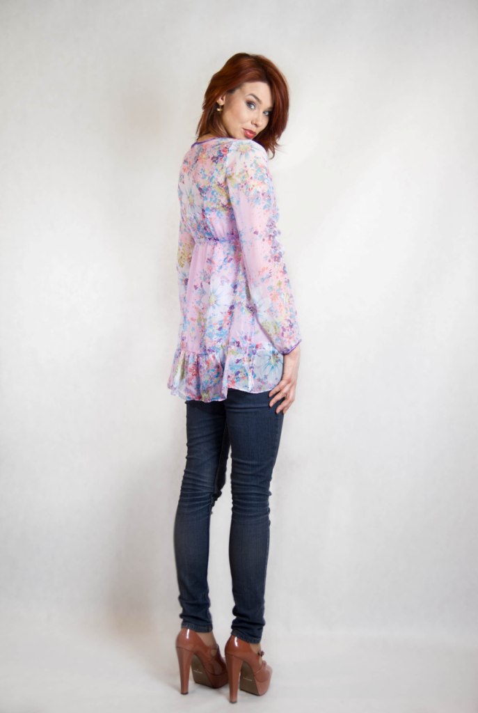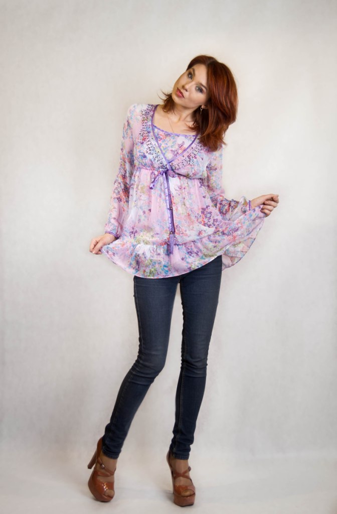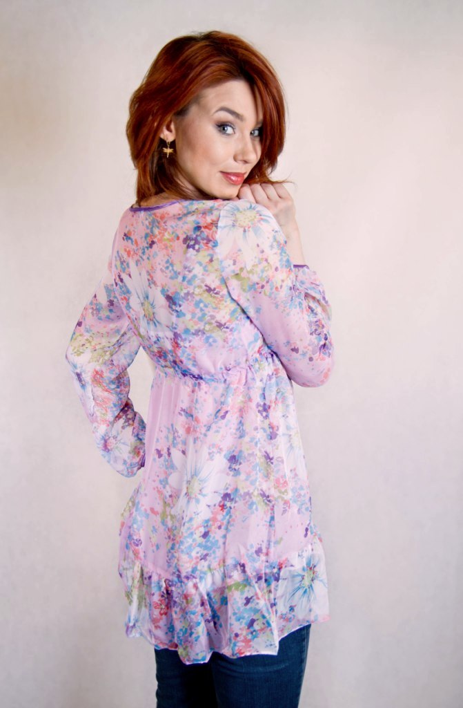 Предлагаемая вашему вниманию туника из легкого летящего шифона красиво ложится по фигуре, удлиняет и стройнит силуэт. Широкая оборка по низу подола придает бедрам соблазнительность. Туника с длинными расширенными рукавами, присобранная под грудью, с оригинально формленным лифом с эффектом многослойности. V-образный вырез горловины верхнего слоя с женственной оборкой удлиняет шею и притягивает взгляды. Под грудью - кокетливая завязка-бантик.
