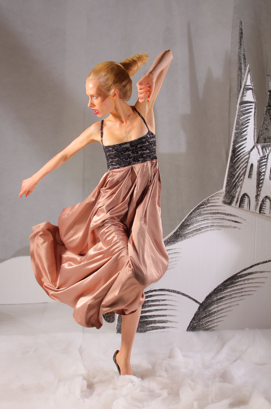 Платье отличается не только своим уникальным фасоном, но и удивительными цветовыми решениями. Платье имеет завышенную отрезную линию талии, благодаря чему, визуально вы выглядите стройнее и грациознее. Две тонкие бретели позволяют акцентировать внимание на стройной шее и красивой линии декольте. Лиф платья выполнен из чёрной ткани, декорированной пайетками.