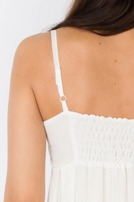 Тонкие бретели можно регулировать по высоте, лиф хорошо очерчен и присборен, а сзади предусмотрена резинка по всей ширине лифа, для лучшего прилегания к телу.