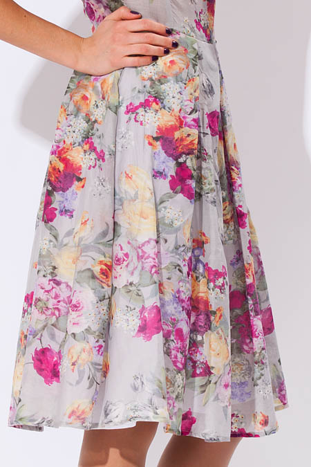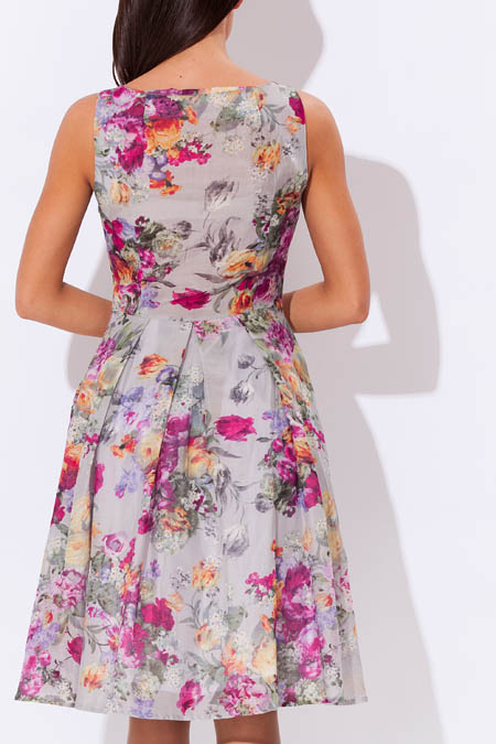 Платье имеет длину до линии колен. Юбка немного пышная, украшена многочисленными прямыми широкими складками