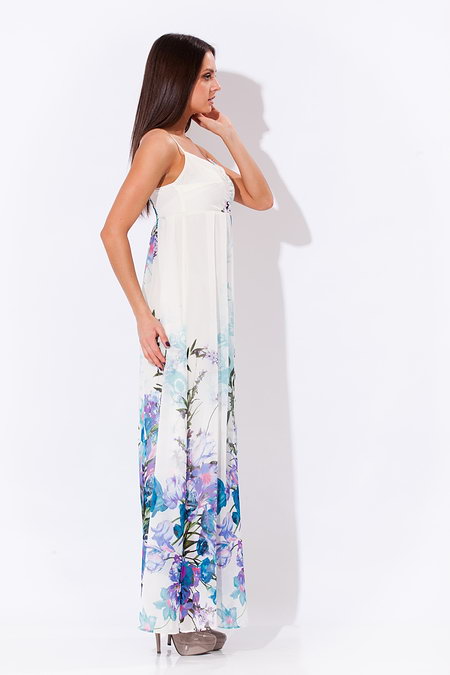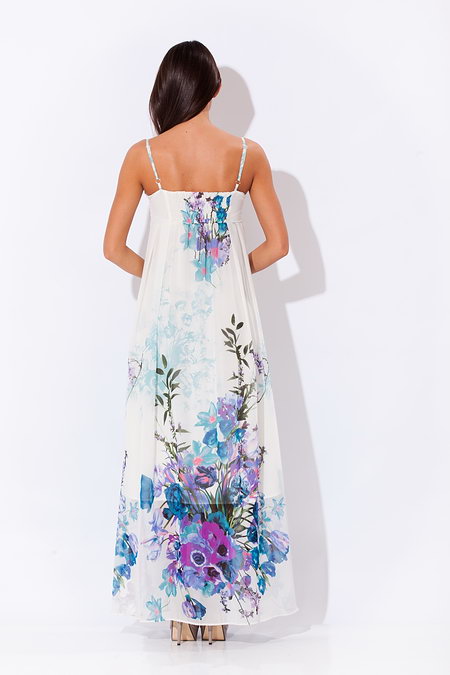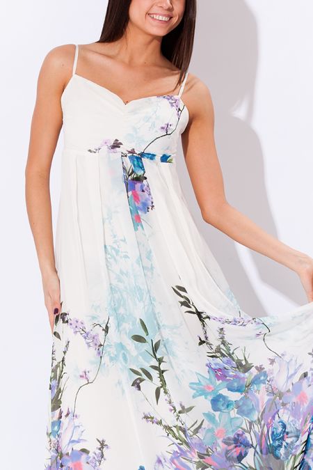 Белый сарафан актуальной макси длины щедро украшен россыпью цветов. Свободный покрой с кокеткой не только дарит ощущение комфорта, но и визуально удлиняет и стройнит фигуру. Очень удобны регулирумые бретели, которые позволят добиться идеальной посадки по фигуре.