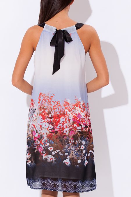Платье лёгкое и свободное. Верхняя часть достаточно необычна – наряд словно держится на широкой атласной ленте, которая завязывается за шеей в красивый замысловатый бант.