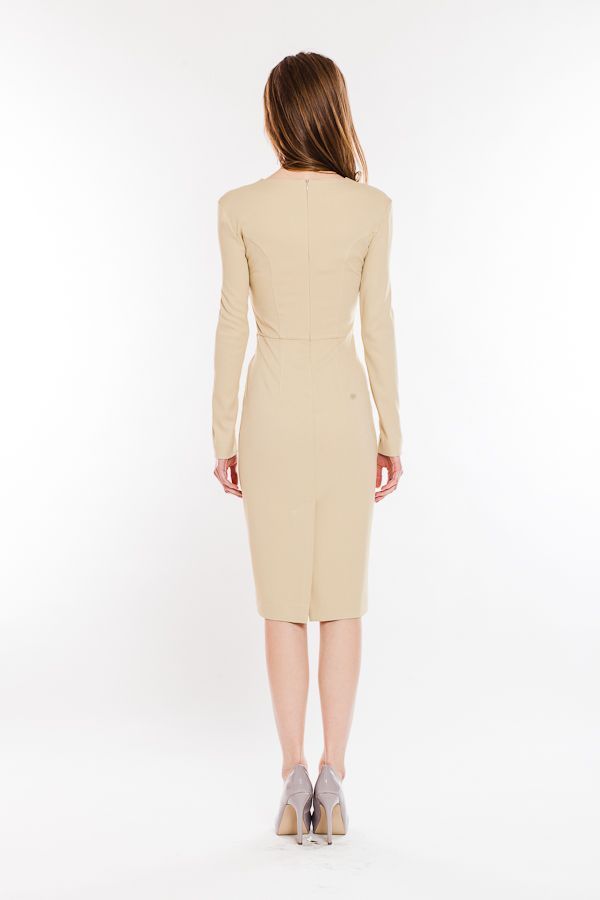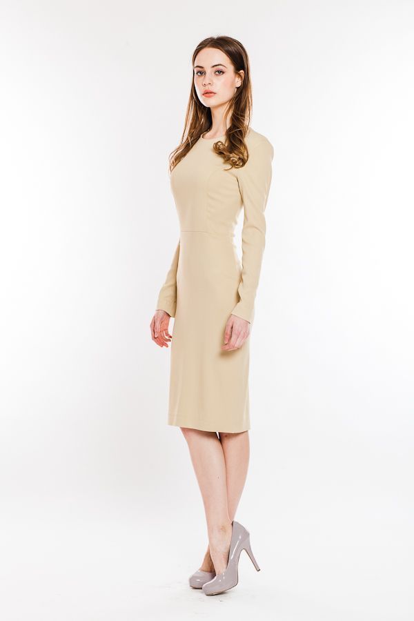 Приталенный стройнящий силуэт, который обеспечивается потайной застежкой молнией и высоким разрезом сзади, актуальная миди-длина, нейтральный оттенок - это платье настоящий холст, на котором вы с помощью любимых аксессуаров нарисуете свой неповторимый и всегда невероятно элегантный образ.