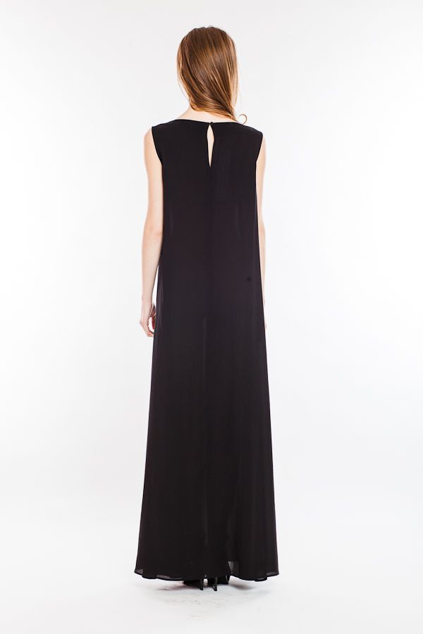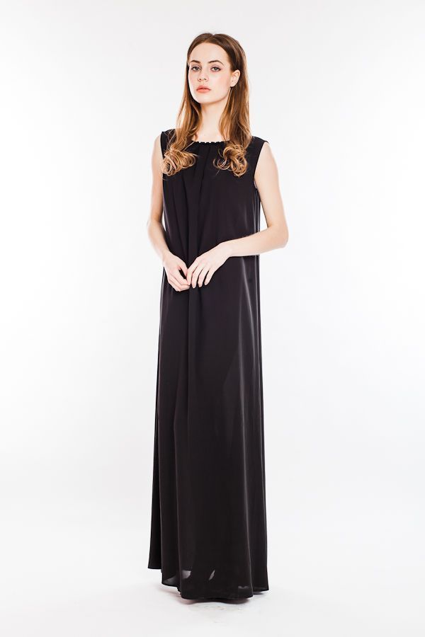 Платье свободного покроя, без рукавов, супер актуальной макси длины. Оно струится по груди и ниспадает шикарными волнами, образованными легкими складками по краю горловины-лодочки. Глубокий черный цвет выглядит очень элегантно, а благодаря легкому свечению тонкого высококачественного материала ваш образ кажется не темным, а таинственным и интригующим.