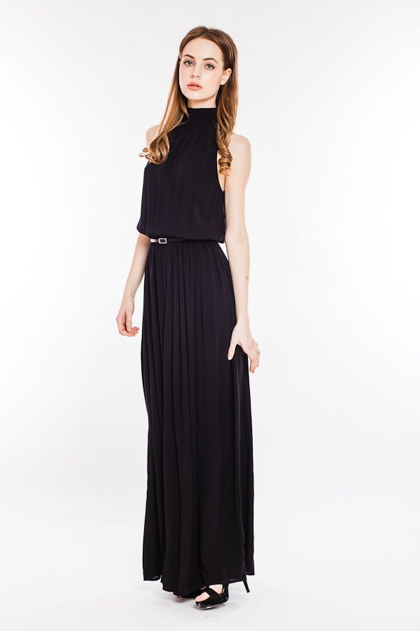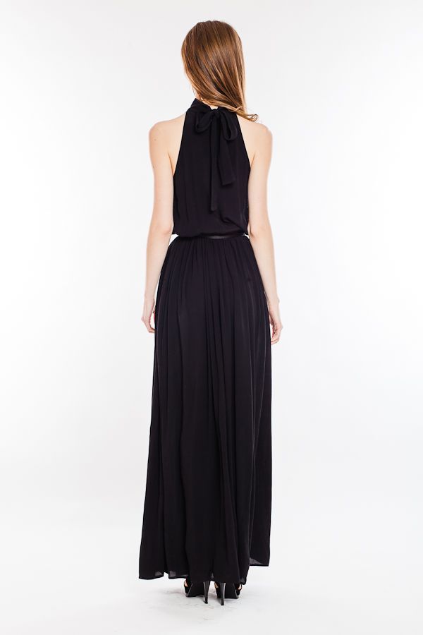 Актуальная длина в пол, удобная широкая юбка, лиф с американской проймой и воротником-стойкой, который продалжается бантом-завязкой сзади - этот оригинальный покрой очень элегантно и интригующе смотрится в глубоком черном цвете.