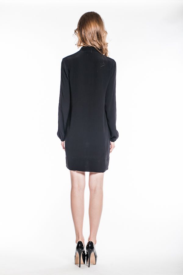 Свободный прямой силуэт дарит комфорт и подчеркивает непринужденность образа, стильный бант привлекает внимание к высокому воротнику и закрытому лифу, который интригует гораздо больше, чем самое откровенное декольте, а длинные присобранные рукава выглядят неожиданно трогательно.