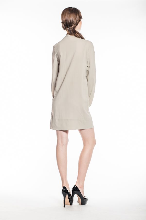 Свободный прямой силуэт дарит комфорт и подчеркивает непринужденность образа, стильный бант привлекает внимание к высокому воротнику и закрытому лифу, который интригует гораздо больше, чем самое откровенное декольте, а длинные присобранные рукава выглядят неожиданно трогательно.