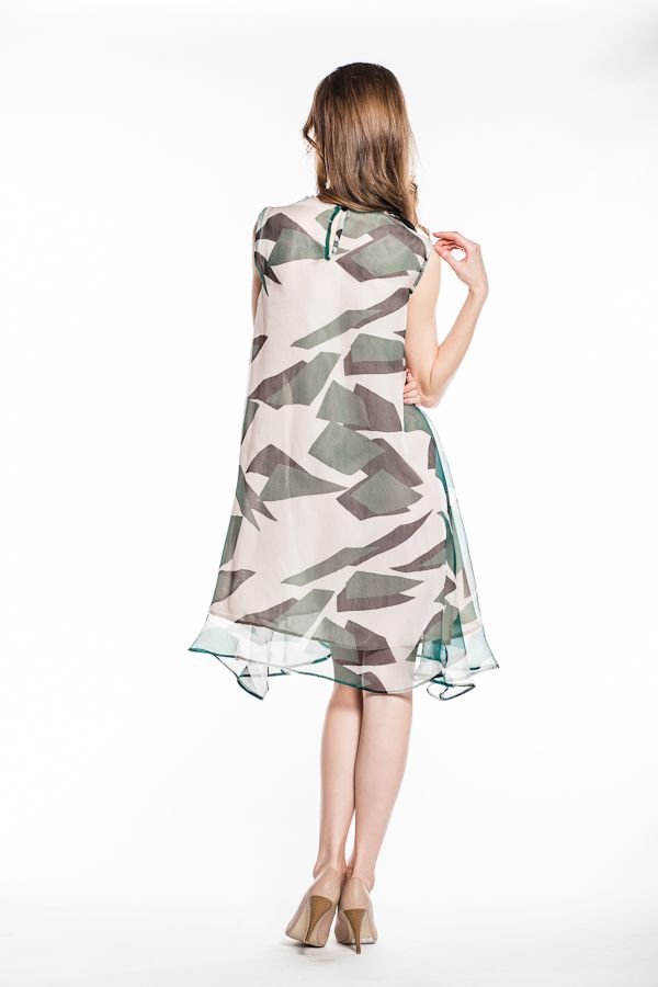 Покрой "трапеция", прозрачный верхний слой из летящего материала, сдержанная длина до линии колен, высокий вырез горловины, полностью закрывающий область декольте и пестрый, но классический принт в милитаристическом стиле - в этой модели удивительно гармонично соединились настолько разные стили и направления, что оно просто не может остаться незамеченным настоящими модницами!