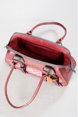 Сумка поражает своими размерами. Однако, несмотря на это, в неё можно много чего уместить. Застёгивается на металлическую застёжку типа «поцелуйчик». Спереди украшена кожаными застёжками с металлическими элементами декора.