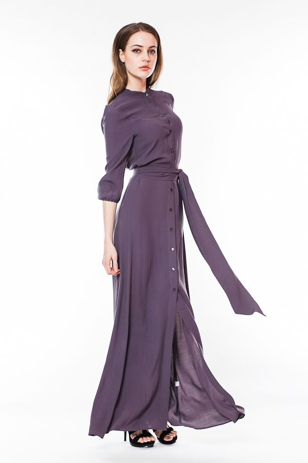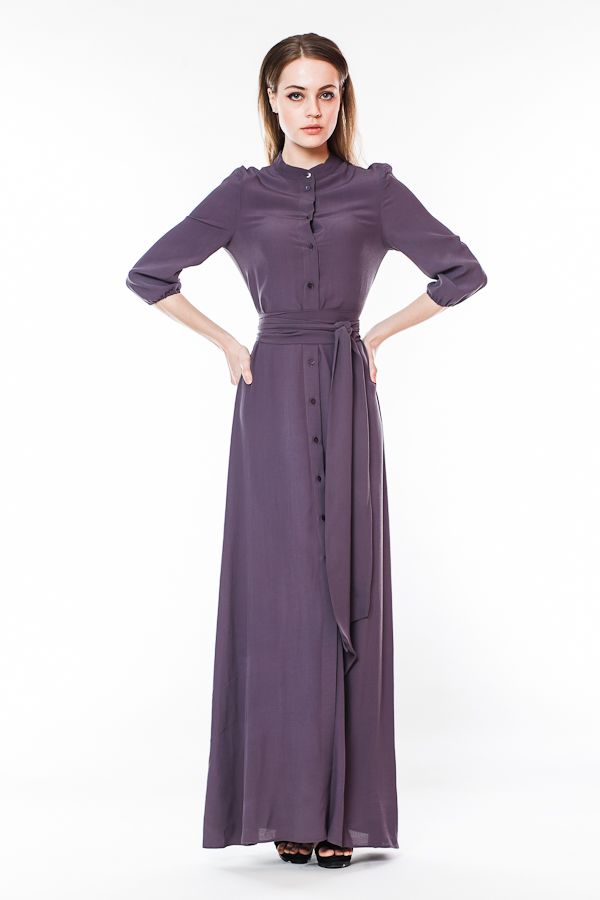 Вам нравится деловой стиль? Вы находите рубашки удобными и красивыми деталями одежды? Обратите внимание на это длинное платье оригинального покроя. Лиф платья выполнен в виде рубашки с воротником-стойкой и рукавами 3/4 на манжетах. Длинная юбка в пол свободная, по центру - продолжение планки с застежками и высокий разрез. Талия подчеркивается широким поясом.