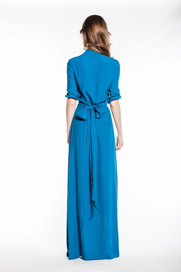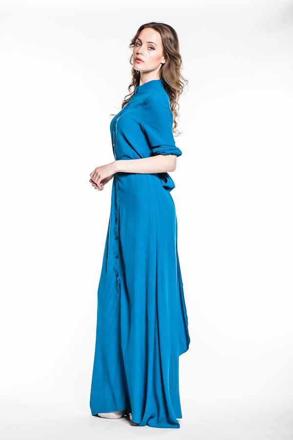 Вам нравится деловой стиль? Вы находите рубашки удобными и красивыми деталями одежды? Обратите внимание на это длинное платье оригинального покроя. Лиф платья выполнен в виде рубашки с воротником-стойкой и рукавами 3/4 на манжетах. Длинная юбка в пол свободная, по центру - продолжение планки с застежками и высокий разрез. Талия подчеркивается широким поясом.