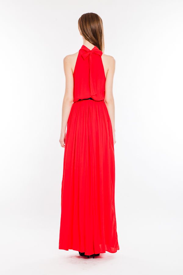 Актуальная длина в пол, удобная широкая юбка, лиф с американской проймой и воротником-стойкой, который продалжается бантом-завязкой сзади - этот оригинальный покрой очень элегантно и интригующе смотрится в стастном красном цвете.