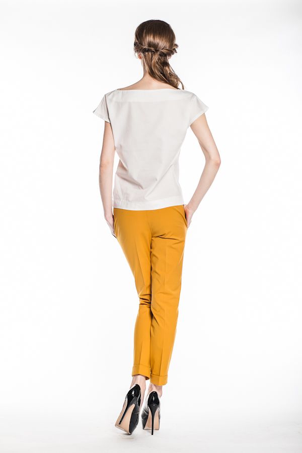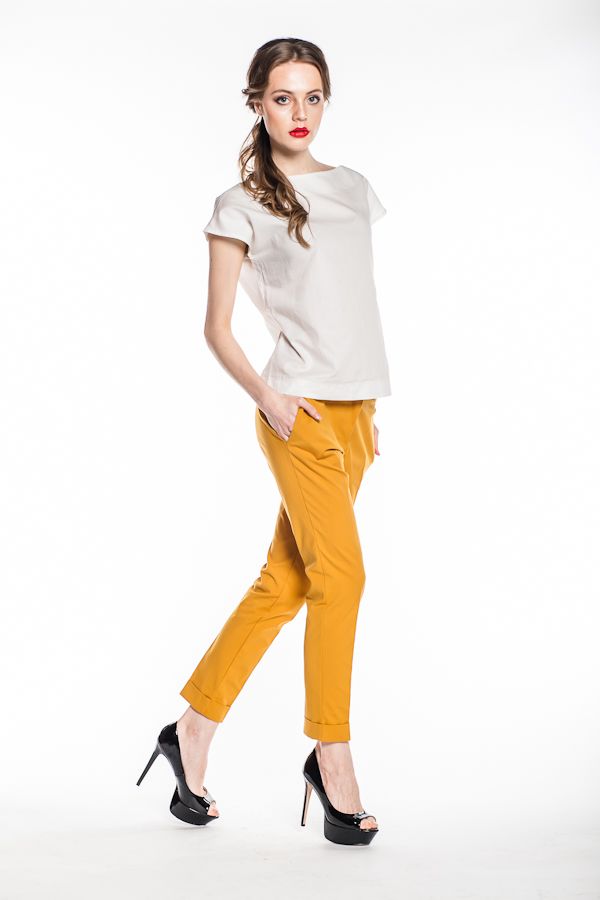 Брюки заужены к низу, однако в области бедер весьма комфортны. Классический пояс с местом для ремня, практичные карманы, элегантные стрелки и милые отвороты по низу штанин - все это в сочетании с необычной длиной до косточки и натуральному материалу позволяет данной модели стать основой стильного образа уверенной в себе женщины, знающей цену не только красоте, но и комфорту и качеству.