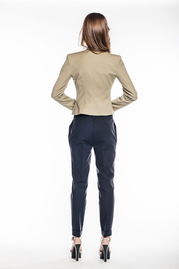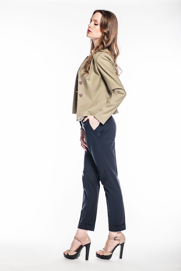 Жакет приталенный, короткий, без воротника, что позволяет красиво подчеркнуть изящную шею. Четкая линия плеч и вытачки по линии талии создают женственный силуэт. Большие контрастные пуговицы выполняют не только практичную, но и декоративную роль.